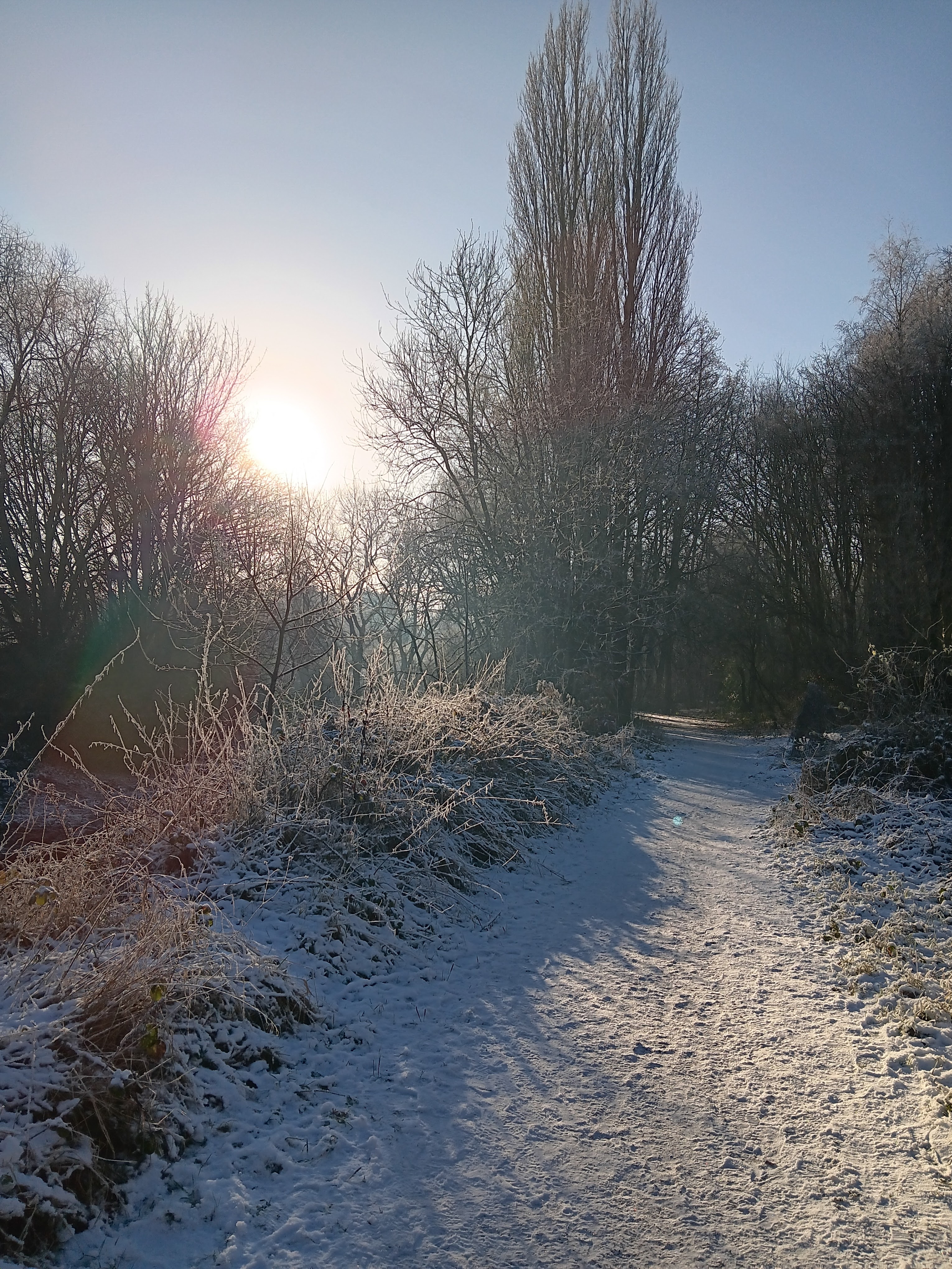 On Friday morning, it felt colder than ever. The canal was still frozen over and it could have been a day to stay at home. But the sky was clear and the sun was doing its best to bring warmth and light. So I took a break at lunchtime, wrapped up in as many layers as I could wear and still move, and headed out for a walk in the woods – just ten minutes from our front door. Of all the places to escape for a lunchtime walk, this is my favourite – especially when the sun is reflecting on the snow and the shadows are dancing between the trees.