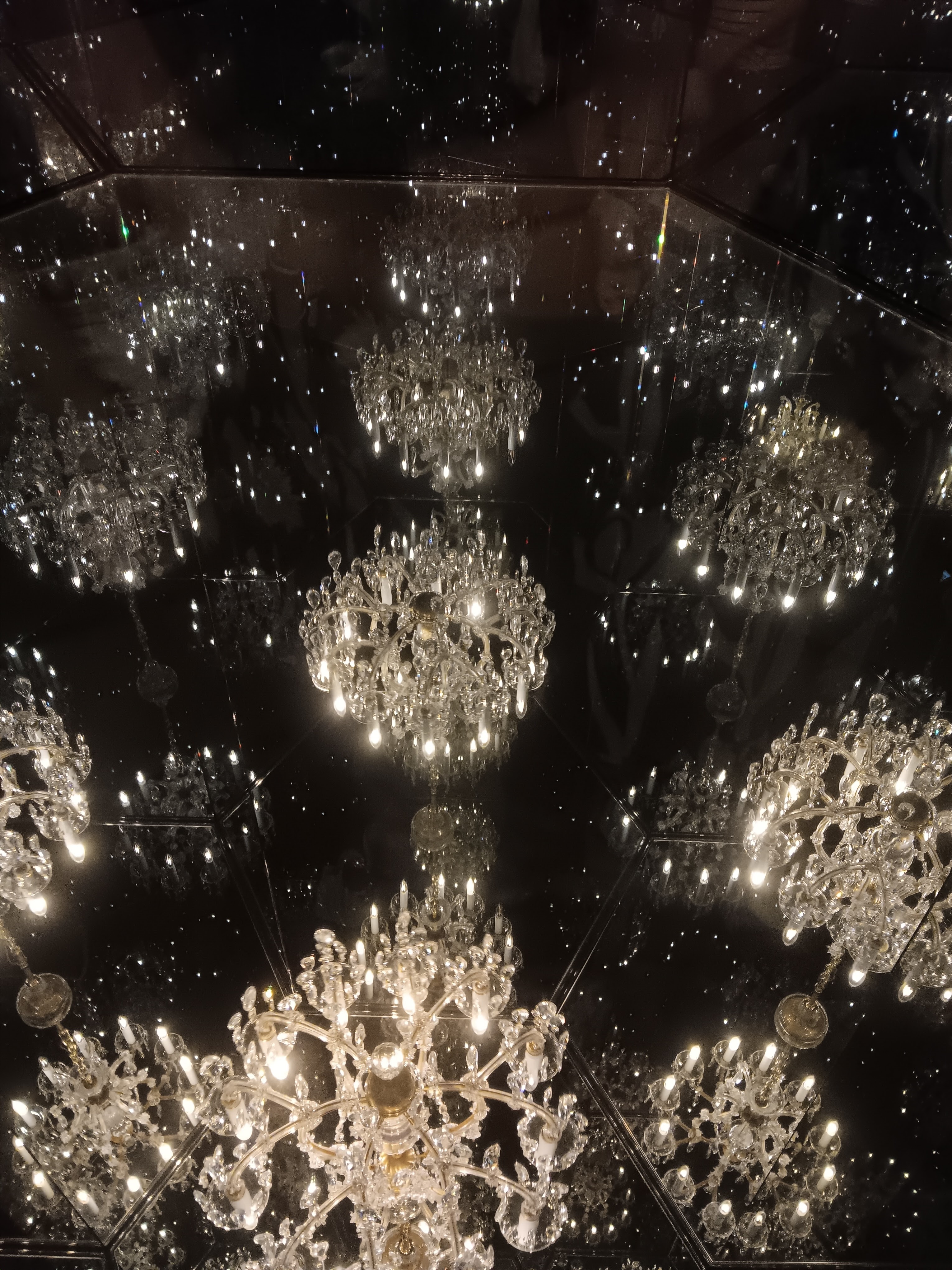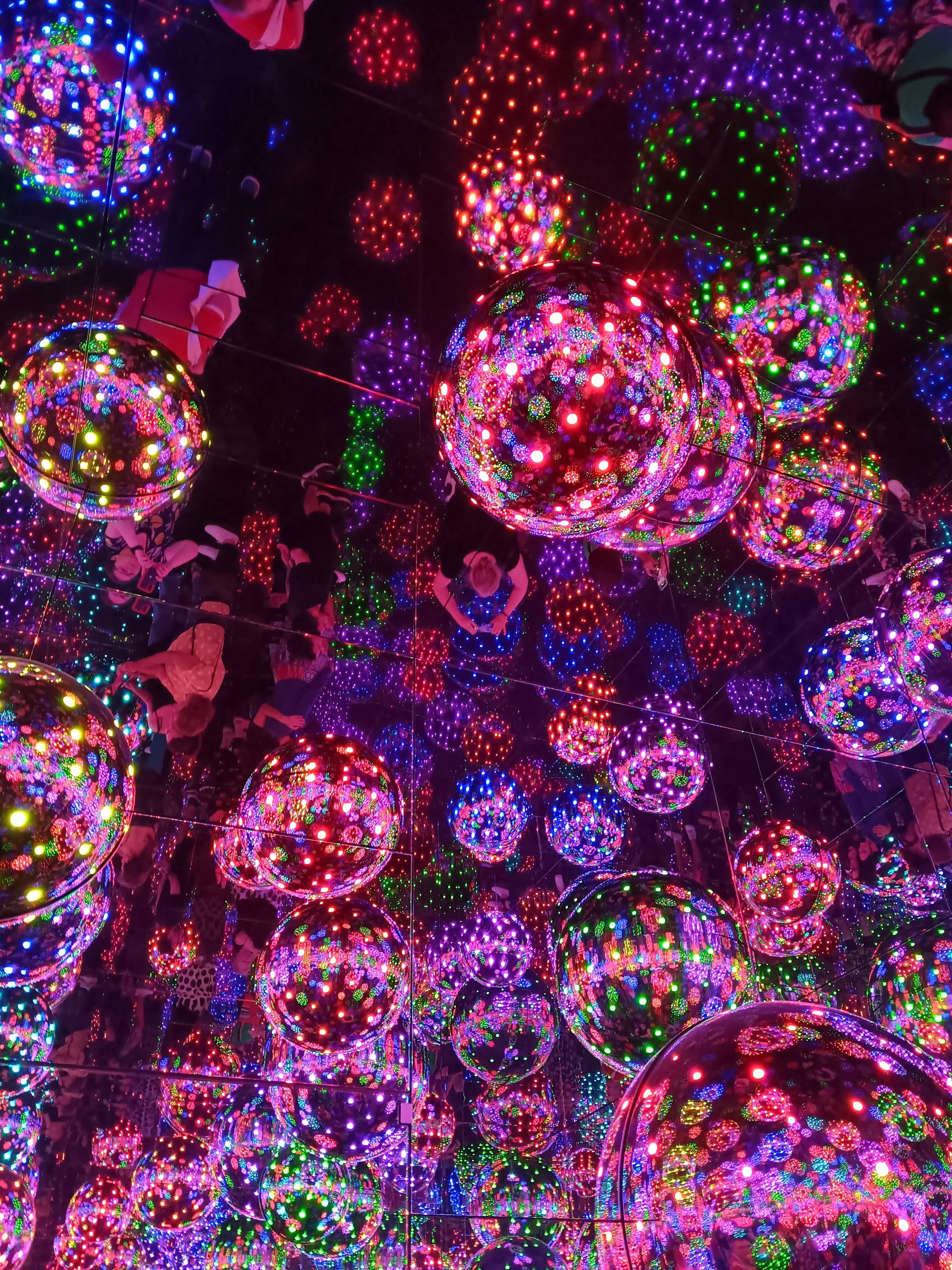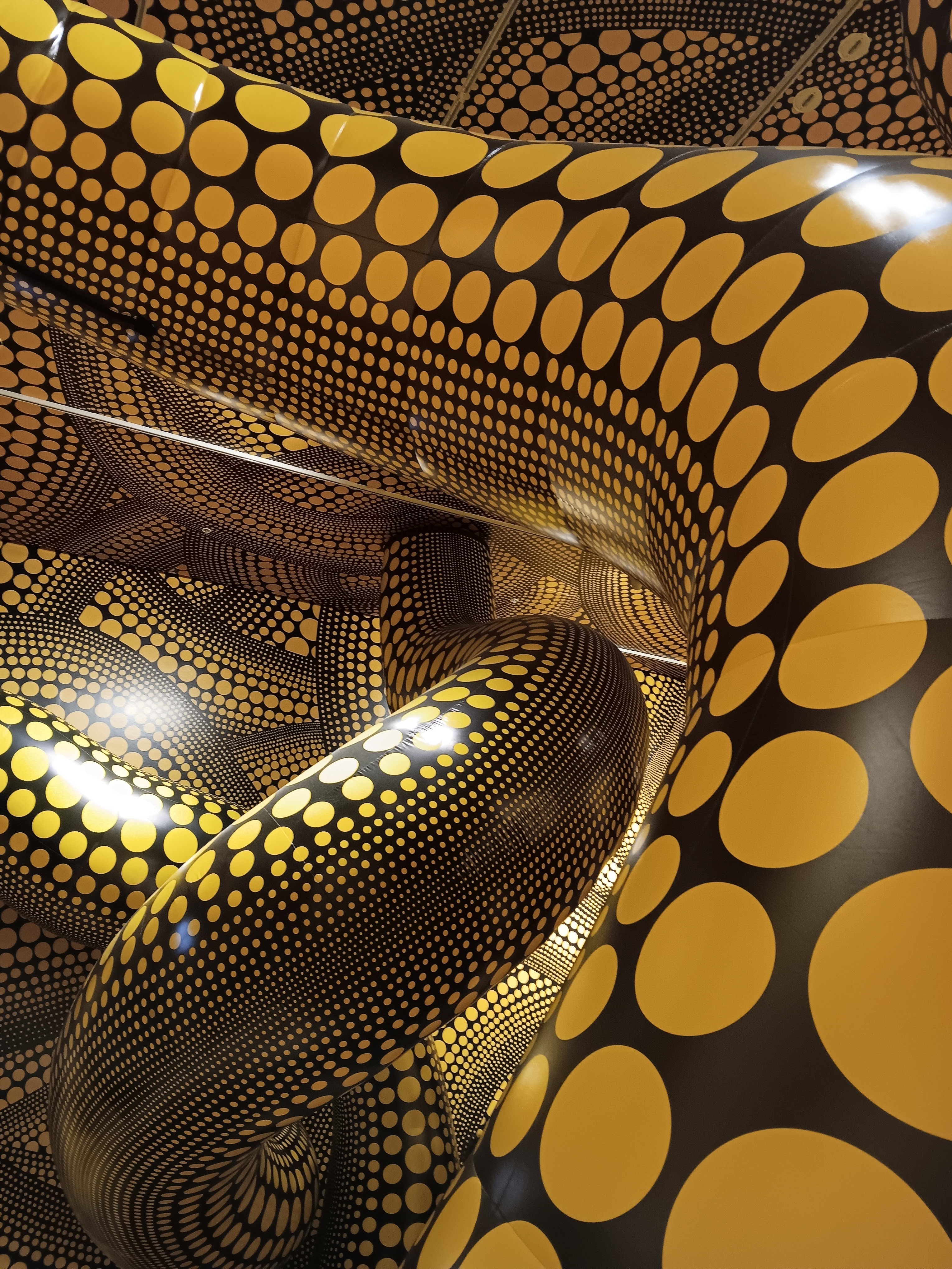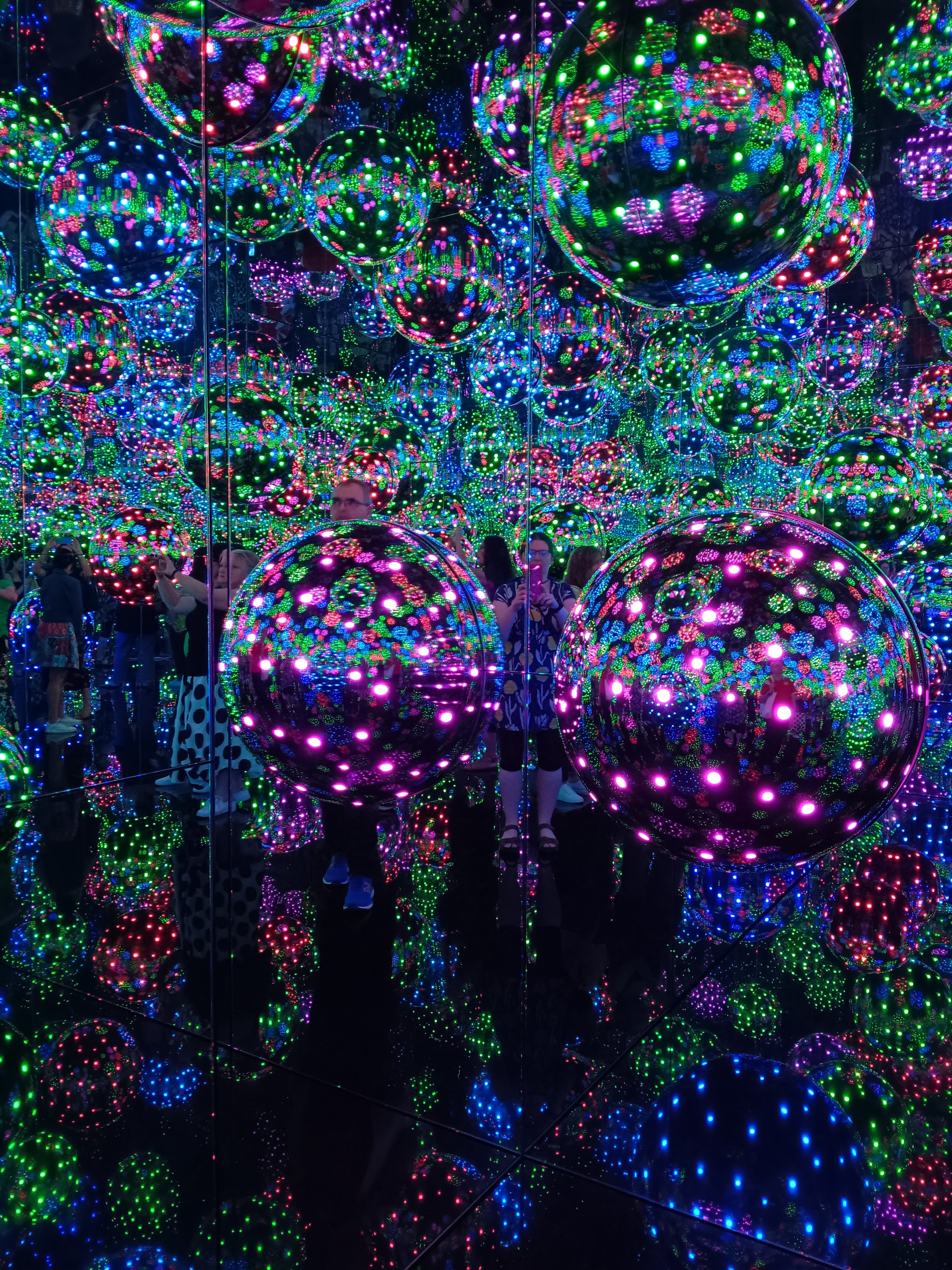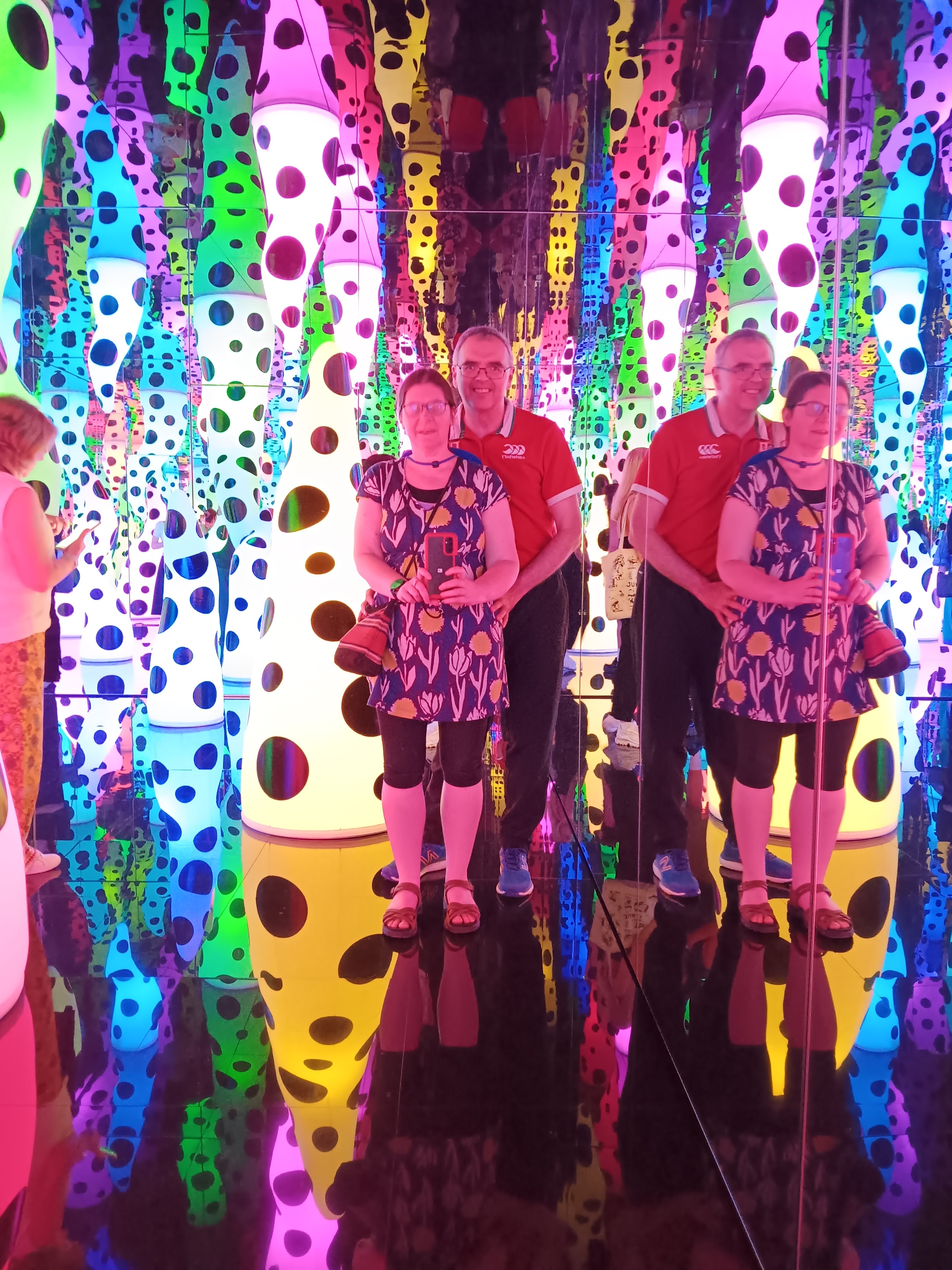 Infinity rooms – these are just wonderful – light, reflections, optical illusions. There were several to explore, each with beautiful descriptive titles, including My Heart is Filled to the Brim with Sparkling Light (created in 2024 and my favourite) and The Hope of the Polka Dots Buried in Infinity will Eternally Cover the Universe (the one with the tentacles and created in 2019). Due to visitor numbers, there were a few queues and time was limited in each of the rooms, but the queueing was worth it.