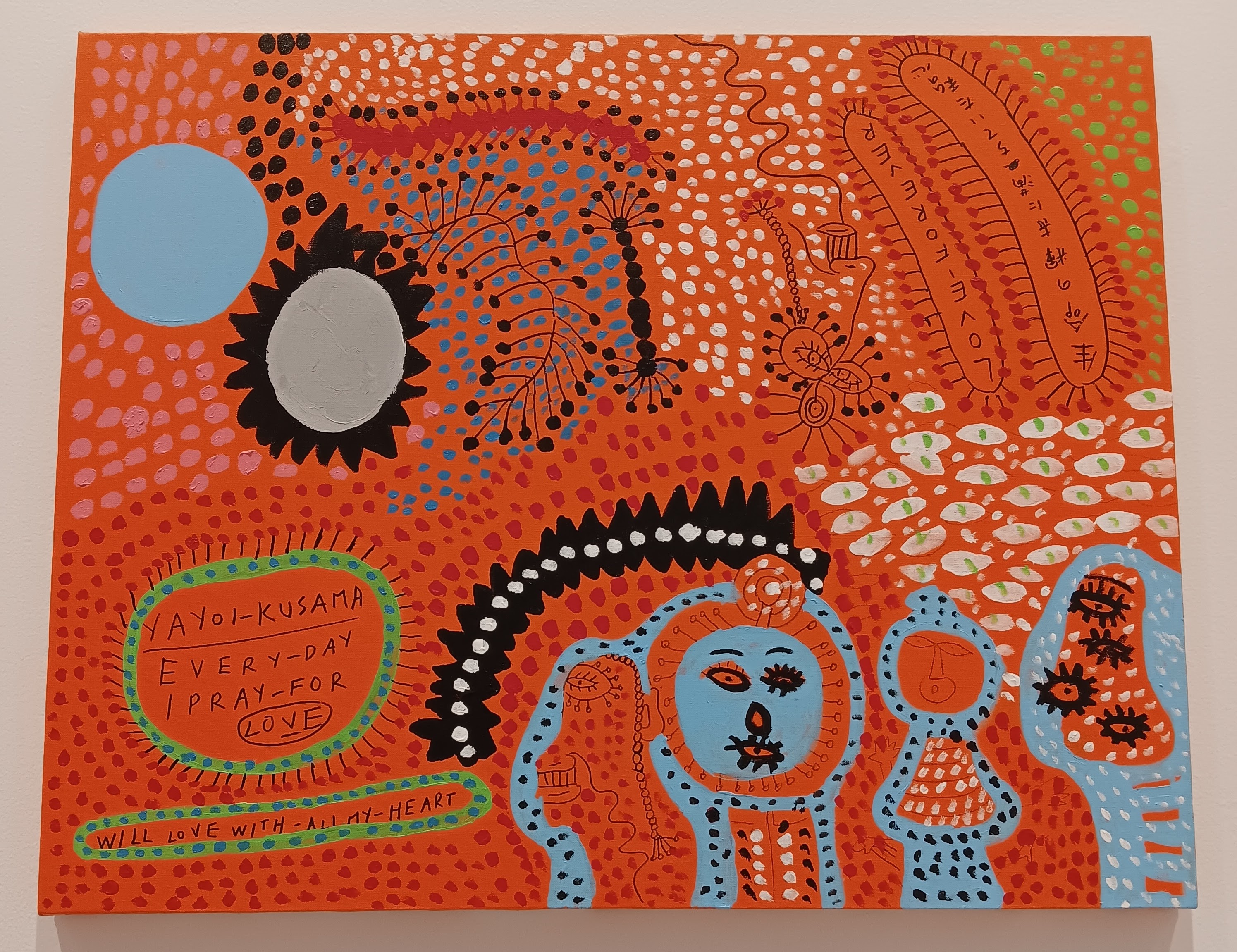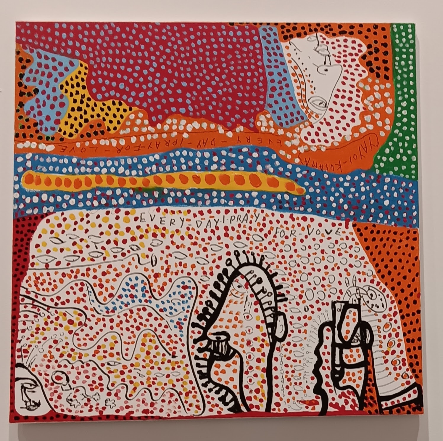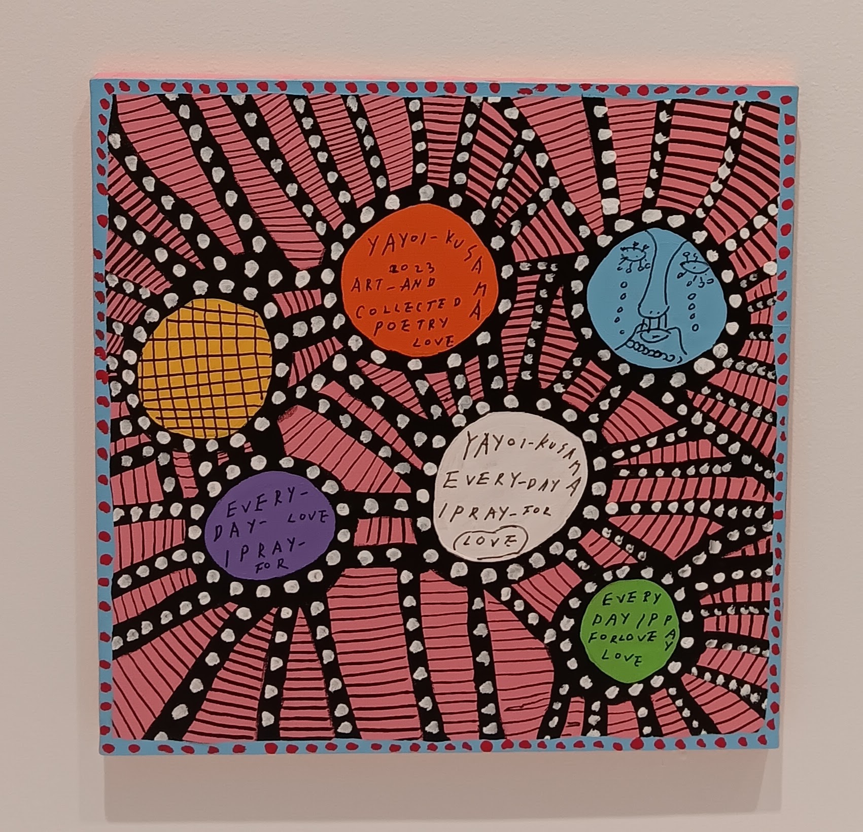 Paintings and murals – although Yayoi Kusama has created smaller scale paintings throughout her career, there are a lot more from recent years, as her mobility has decreased. The final series of paintings in the exhibition featured several creations with the same underlying theme – Every Day I Pray for Love.