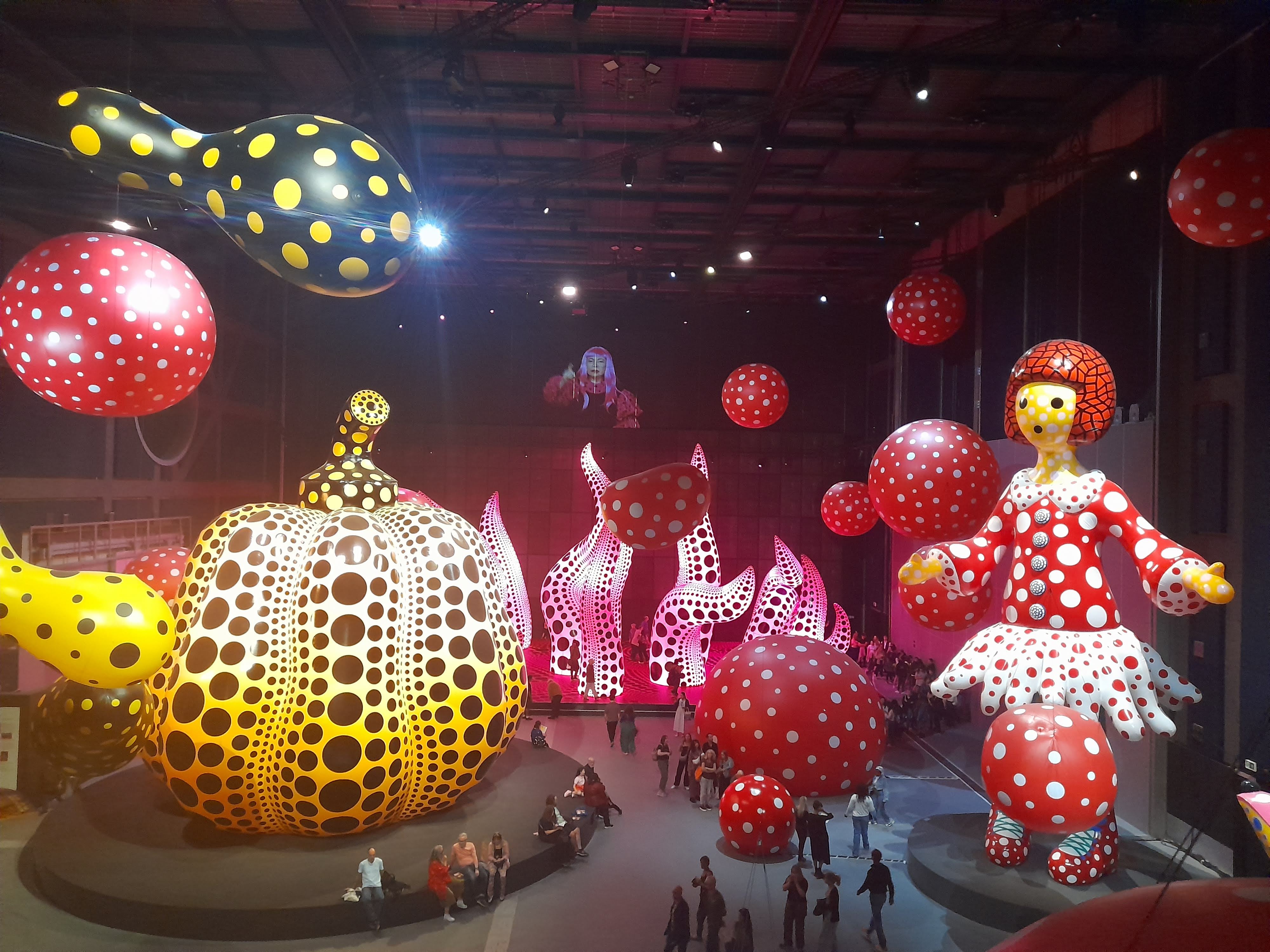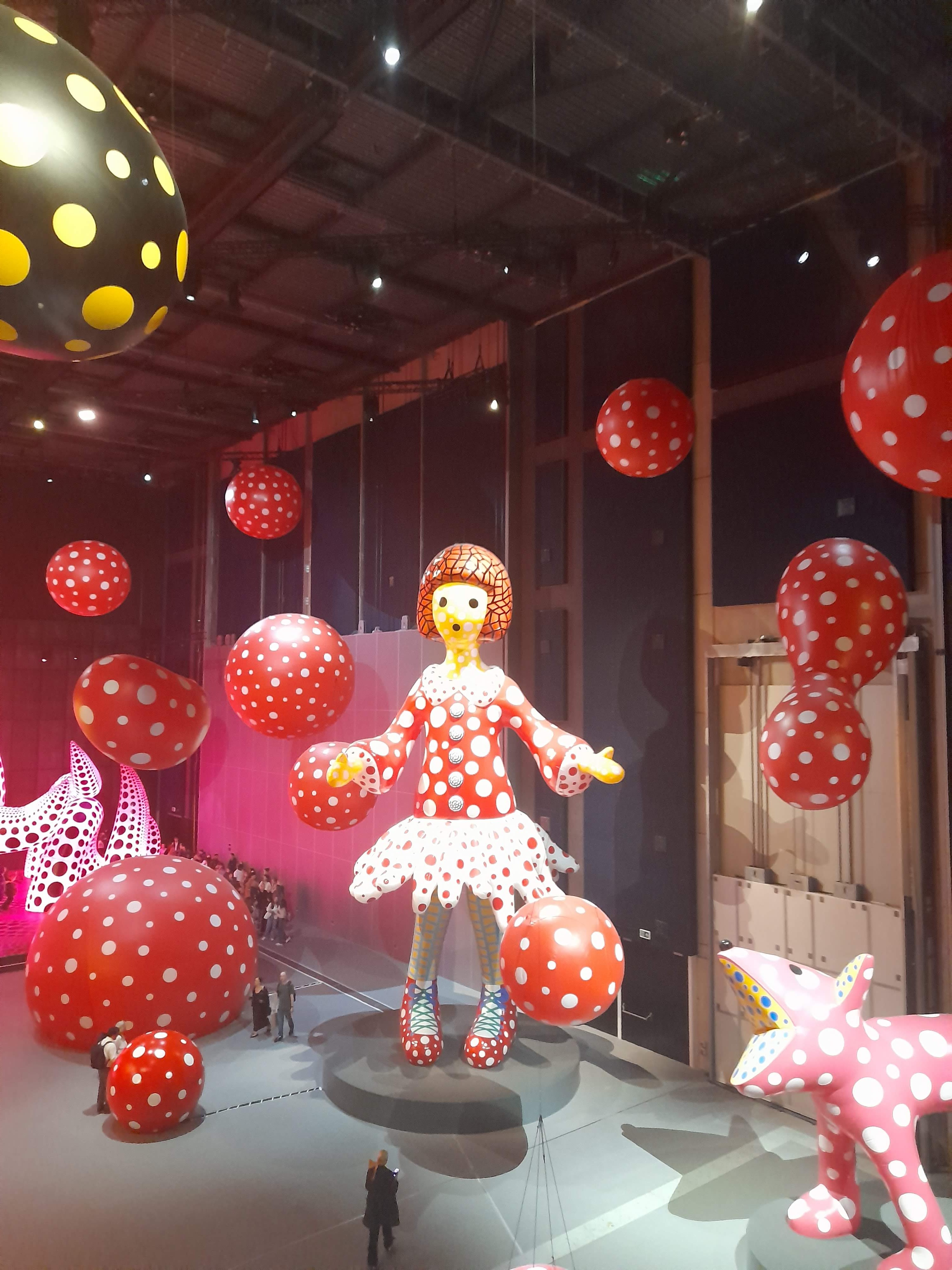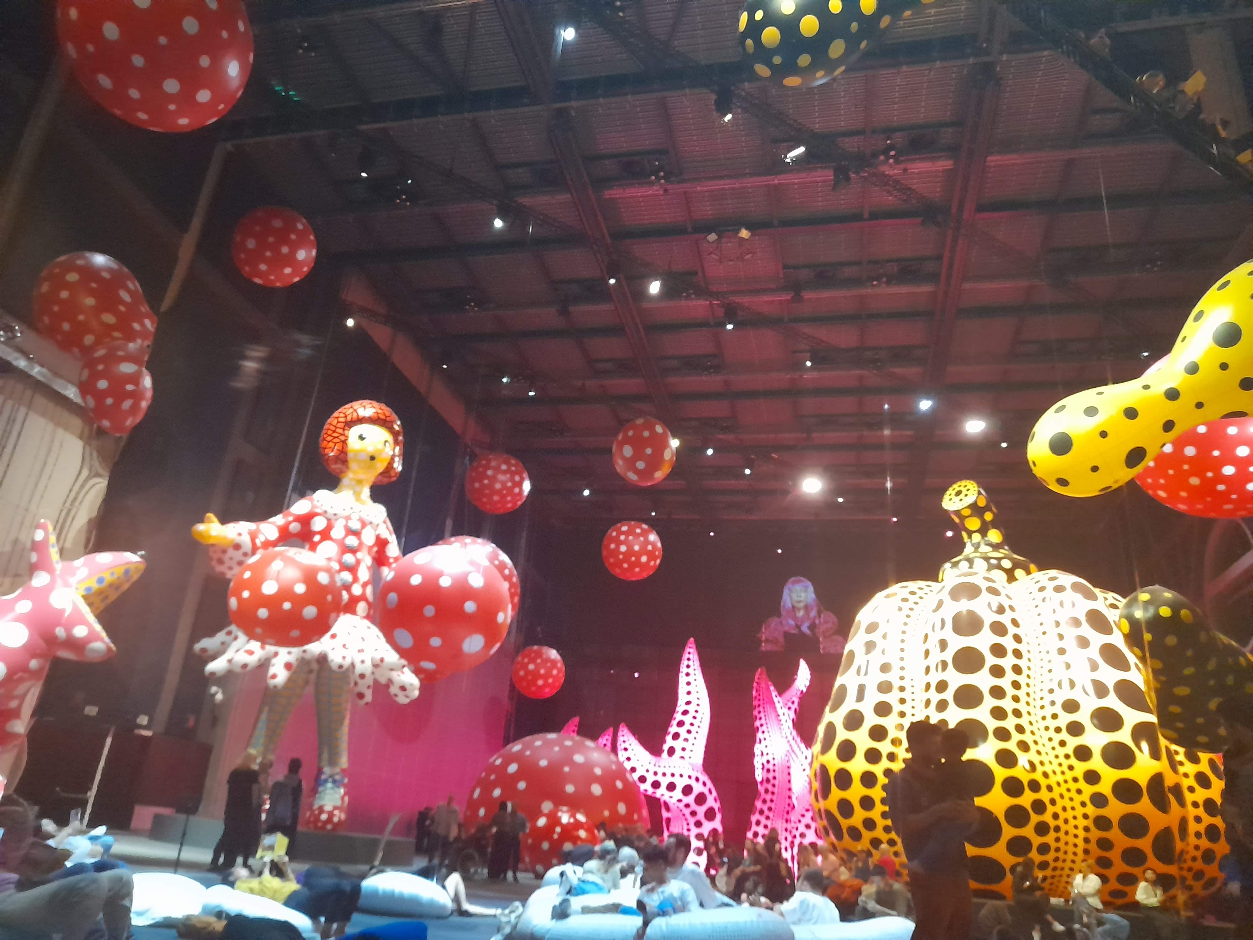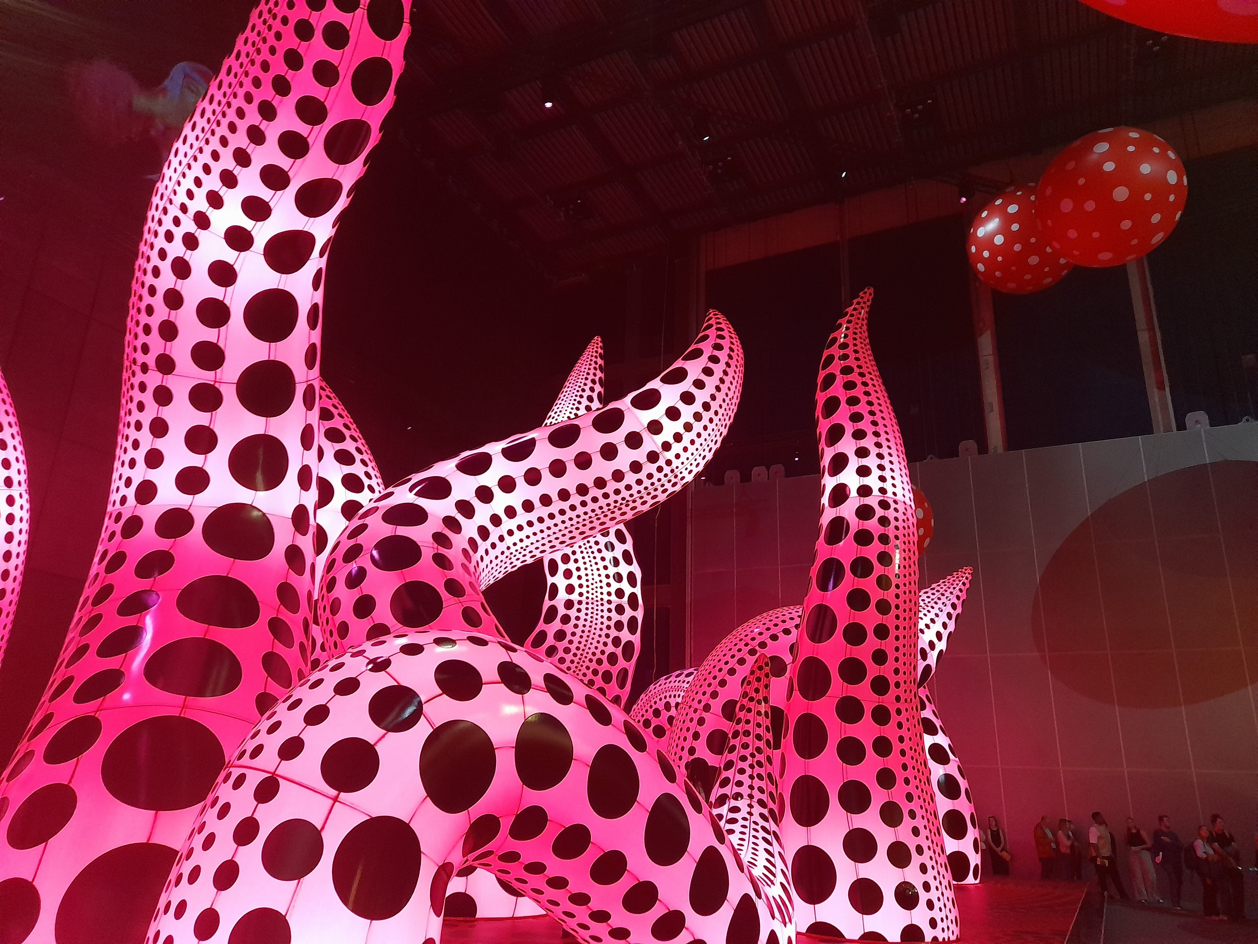 An exhibition of inflatable art by Yayoi Kusama – dots, spotty dogs, reflections, mirrors, giant pumpkins, balloons and childlike figures – at the new Aviva Studios / Factory International venue in Manchester.