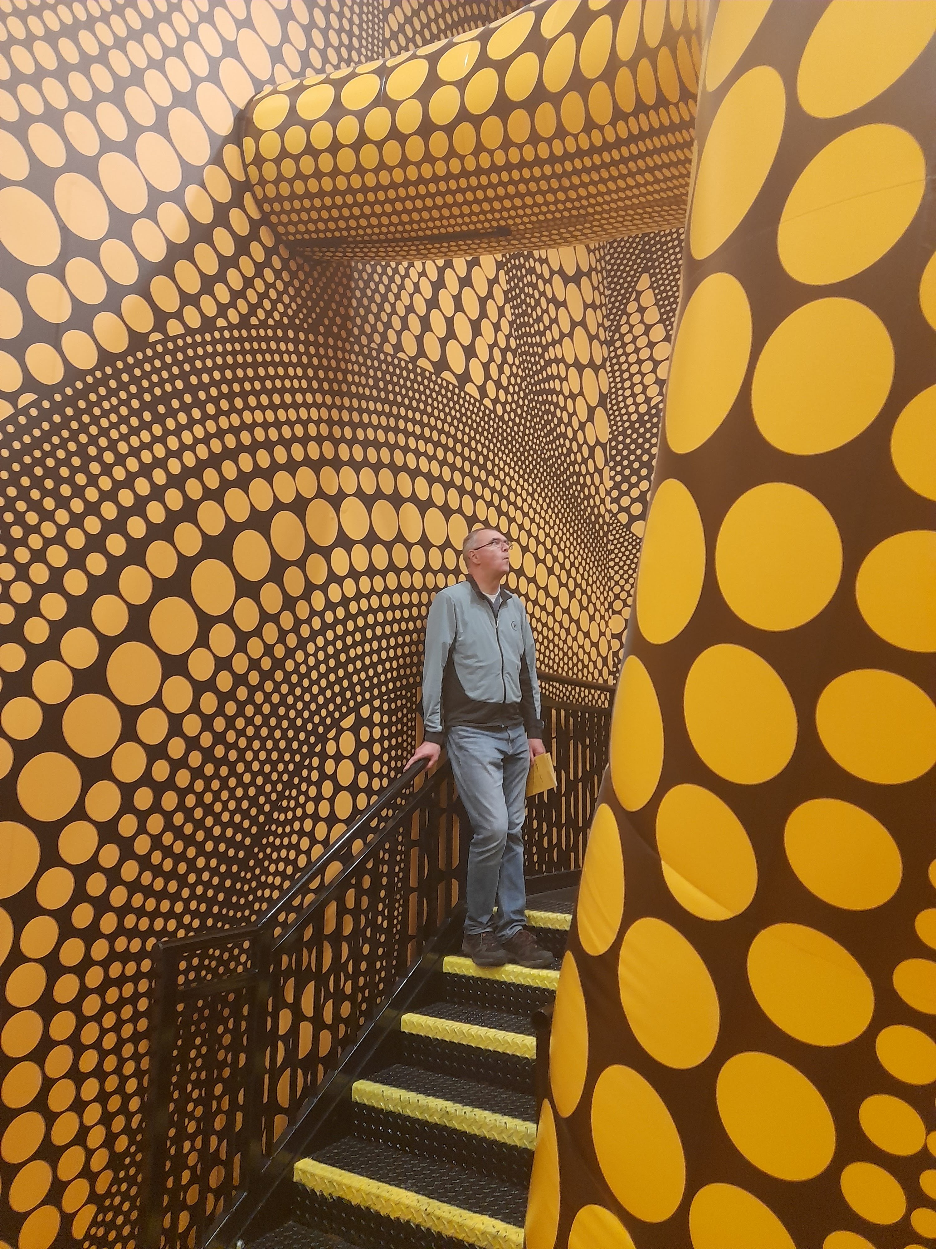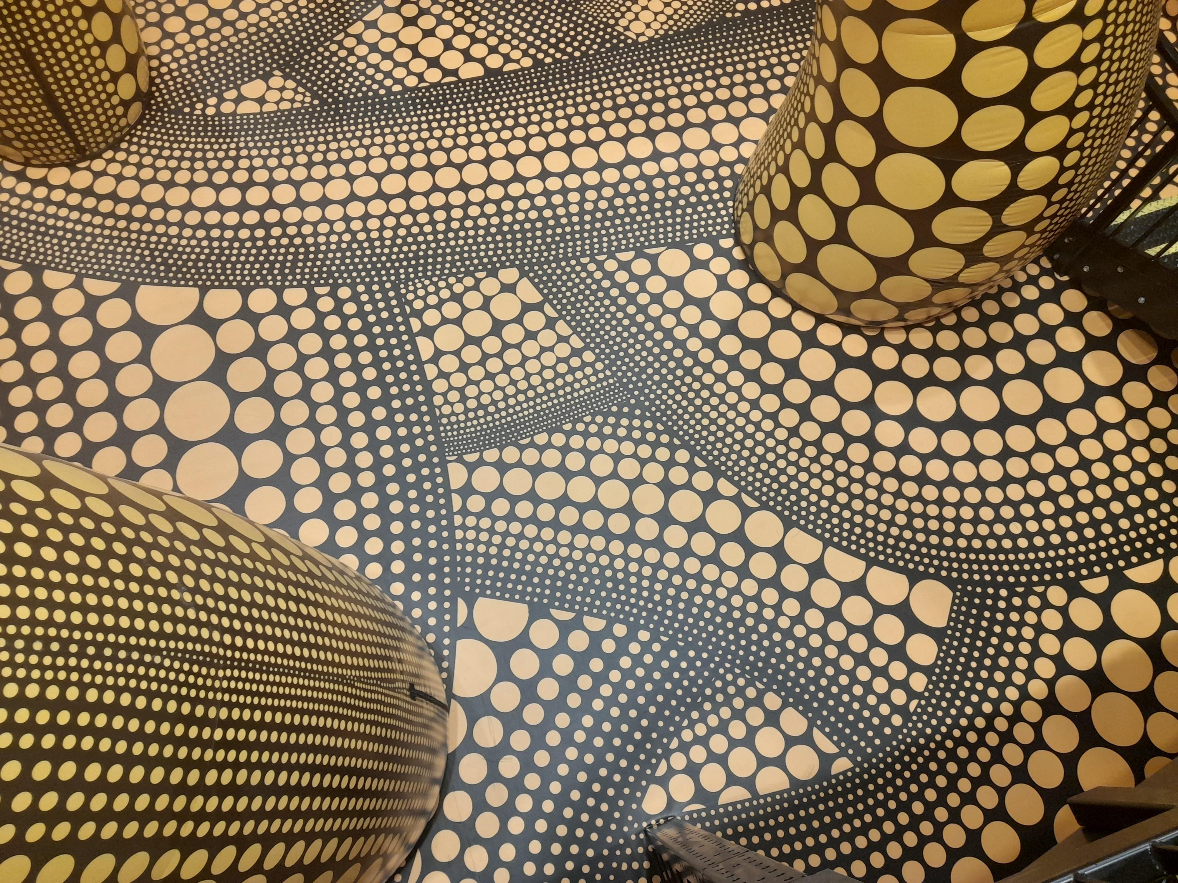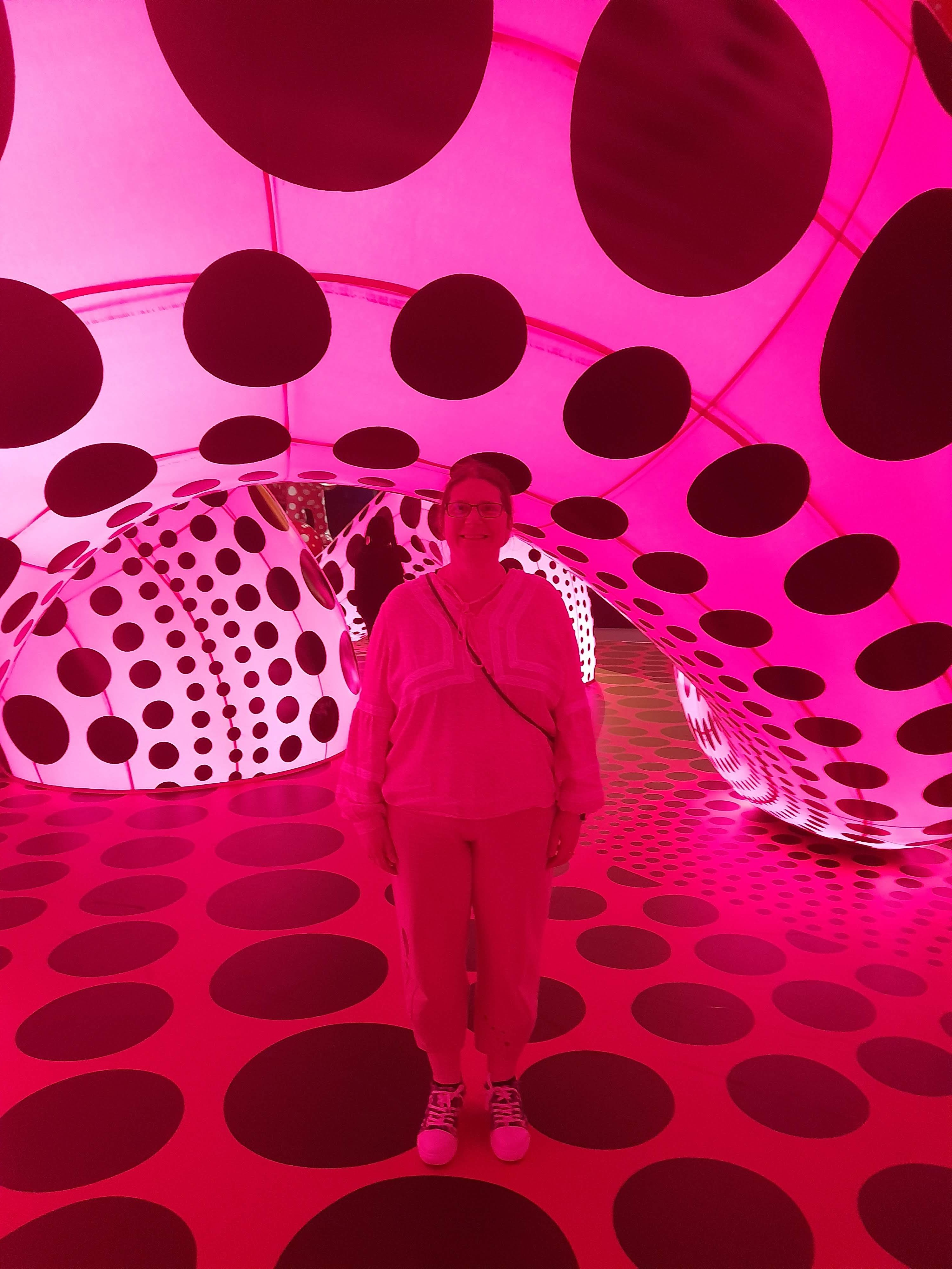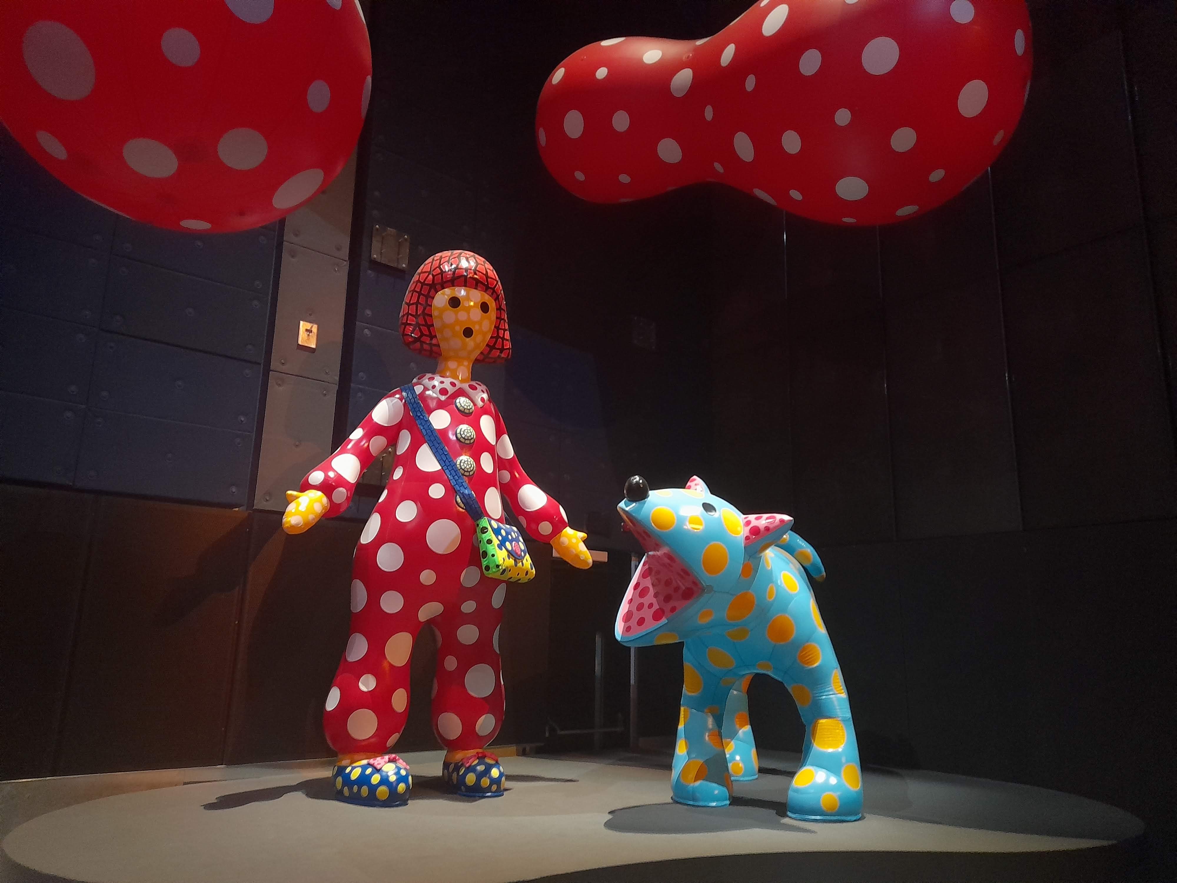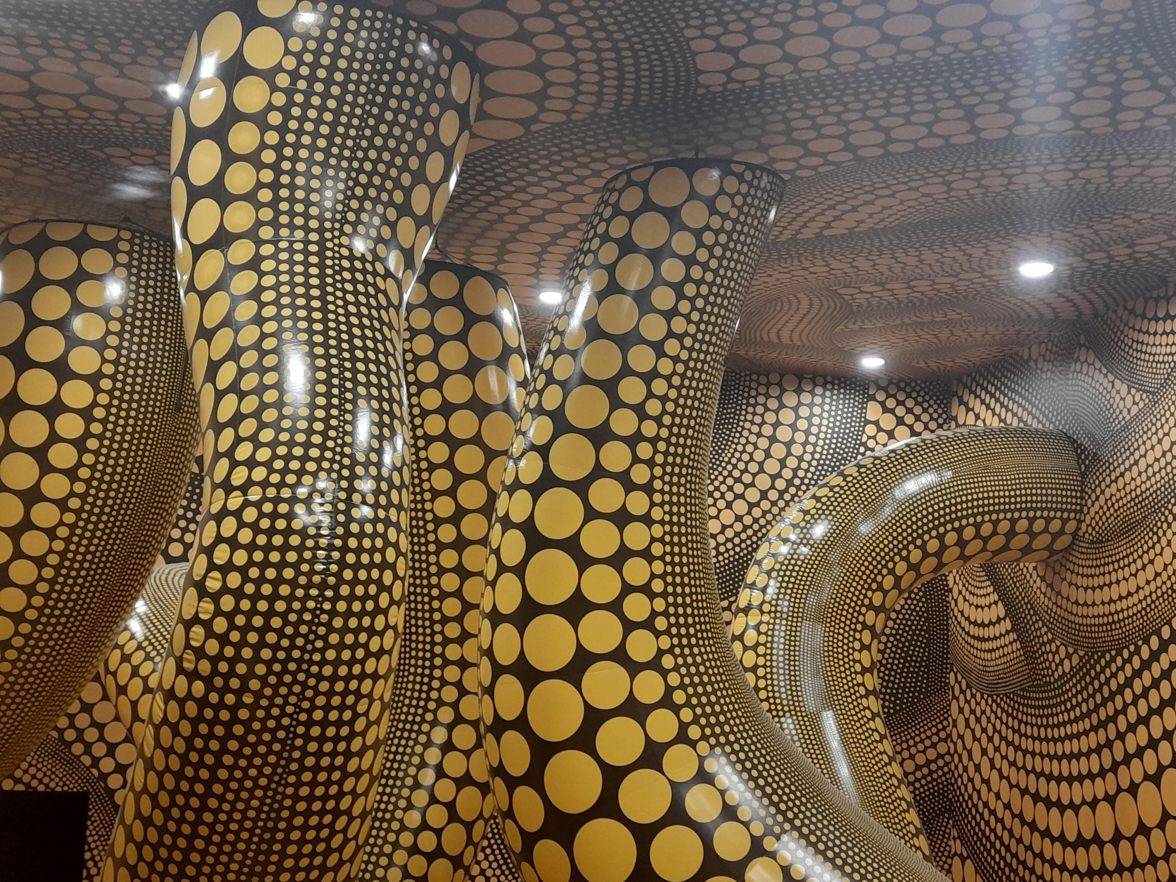 An exhibition of inflatable art by Yayoi Kusama – dots, spotty dogs, reflections, mirrors, giant pumpkins, balloons and childlike figures – at the new Aviva Studios / Factory International venue in Manchester.