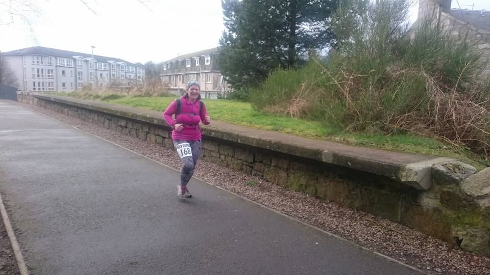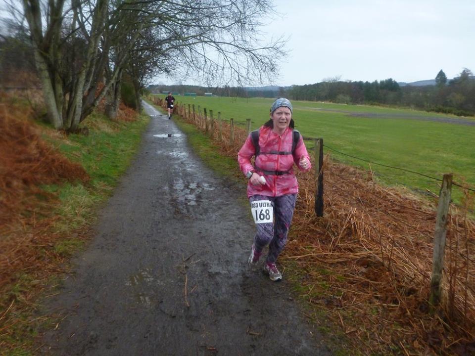 I picked up my first bag of goodies, transported to the checkpoint by the excellent volunteers, refuelled, topped up my water bottle and carried on to the second section of the route, where we left the footpath for a little while and covered a few miles on country lanes, before emerging out into the village of Drumoak. There was a bus waiting at the bus stop heading back towards Aberdeen but ‘only losers take the bus’ so I turned left and carried on running! After a short section of pavement by the road, it was then another off road section close to the River Dee, where a muddy footpath had me slipping all over the place and remembering a crazy night with the Potters Trotters in the rain at Lyme Park.