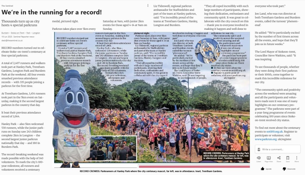 But it is definitely good tired. Tired because of everything that happened over the weekend. Good tired because I am really proud of what we accomplished – as Stoke-on-Trent Centenary Celebrations came to all four parkrun events in the city.