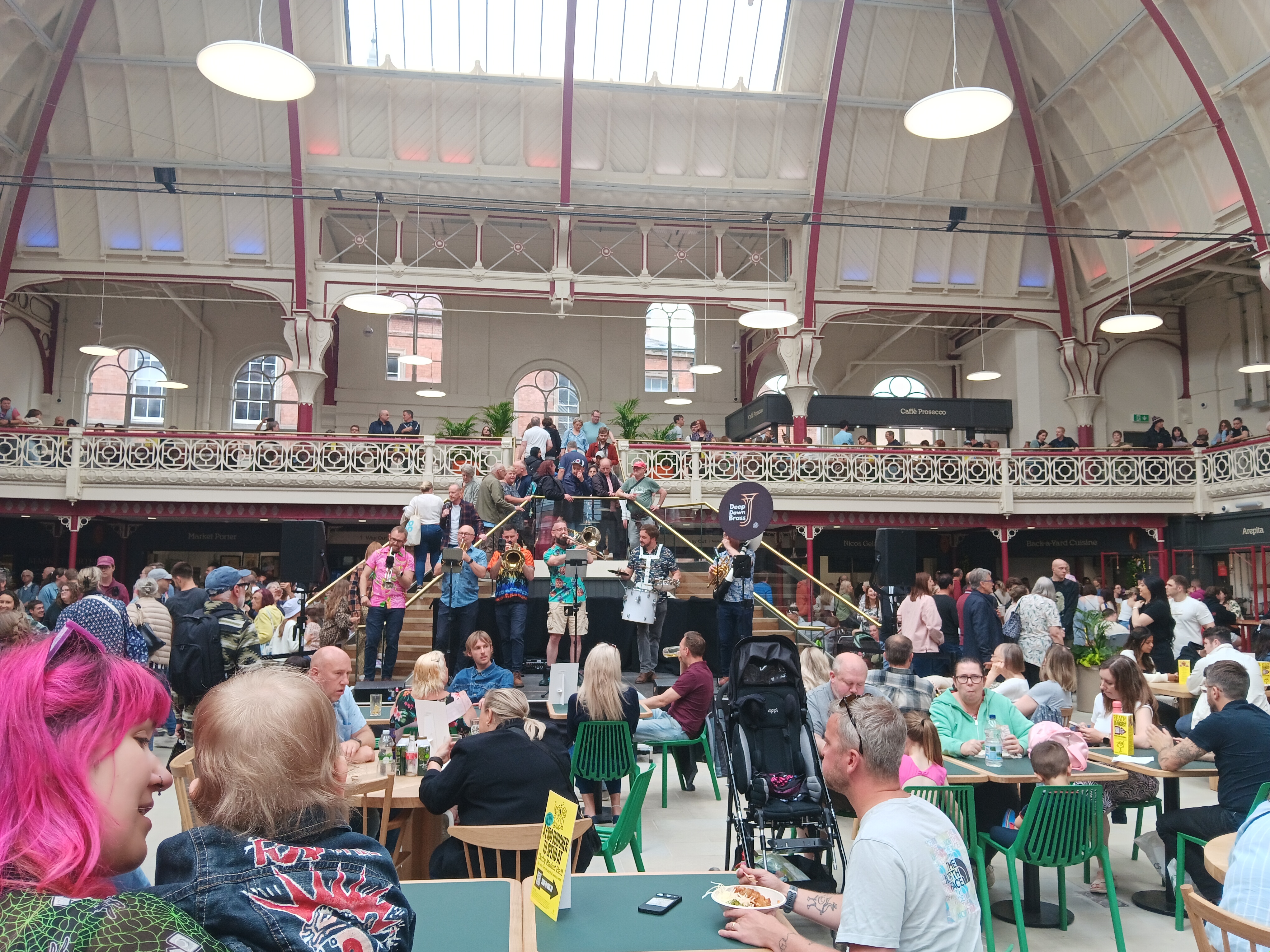 - A quick trip to the newly re-opened market hall (photo below from re-opening day in May when we’d popped down to Derby for an event at the Literary Festival). It was a bit warm yesterday – but it has some great options in the food court. Gourmet scotch egg anyone?